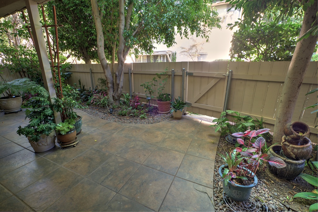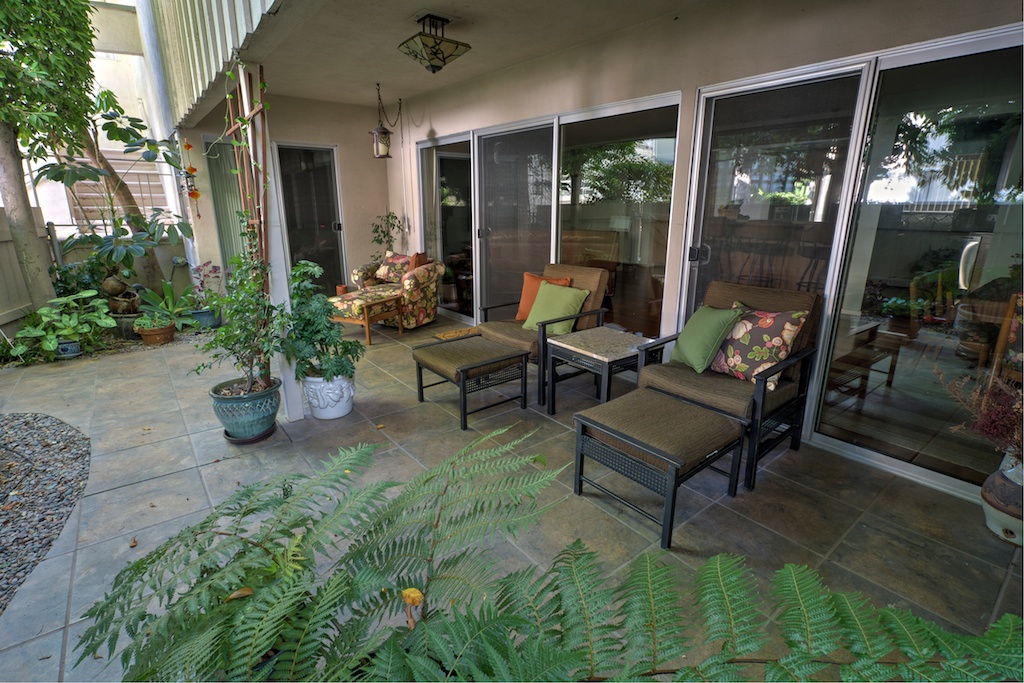 To enjoy a cup of coffee, read a book, or simply gather with friends and relatives to relax after a day trip to L.A., GlenIvy offers a large and fully fenced private outdoor patio. Accessible via the glass doors in the living areas, this space is outfitted with lounge chairs, a sofa chair, coffee table, and lots of trees and potted plants.