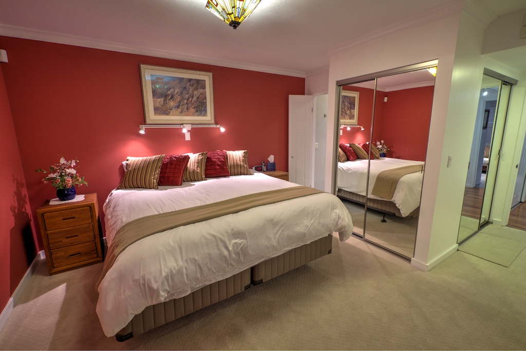 The master suite bedroom is furnished with a king-size bed, luxurious linens, soft carpeted floor, a large wardrobe with mirror doors, and a private bathroom with a tub/shower combination. The second bedroom, which can also serve as an office space, is equipped with a futon, a stylish antique desk and chair, a wardrobe with mirror doors, carpeted floor, and multiple windows providing natural light.