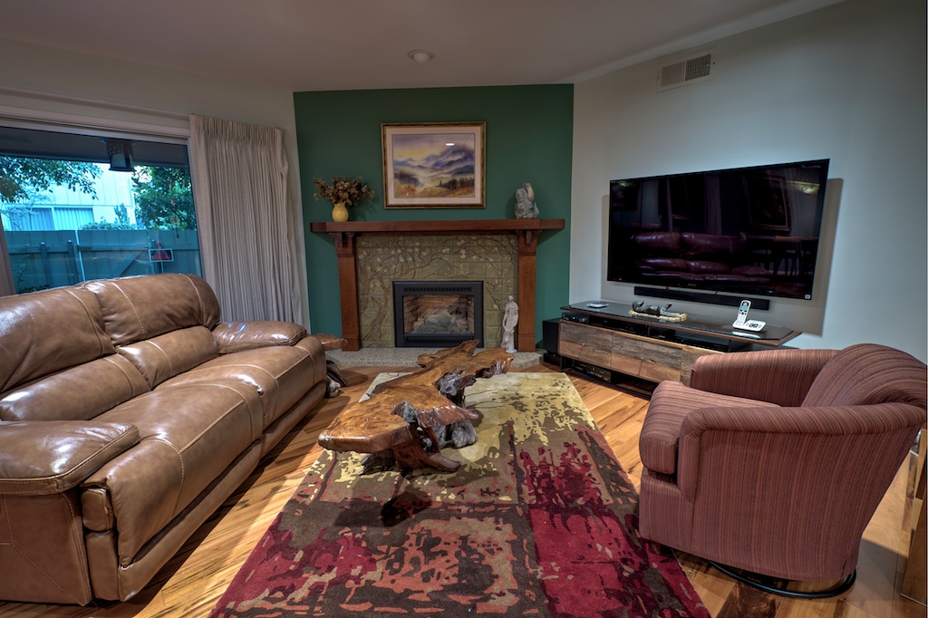 The chic and cozy living room features a sofa, sofa chair, decorative fireplace, beautiful hand-crafted coffee table, Smart TV, and a view of the lovely private outdoor area.