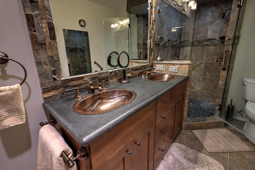 With beautiful copper brass faucets adding a touch of luxury, the main bathroom features a large corner shower, wooden vanity with lots of storage, and dual sinks for your convenience.