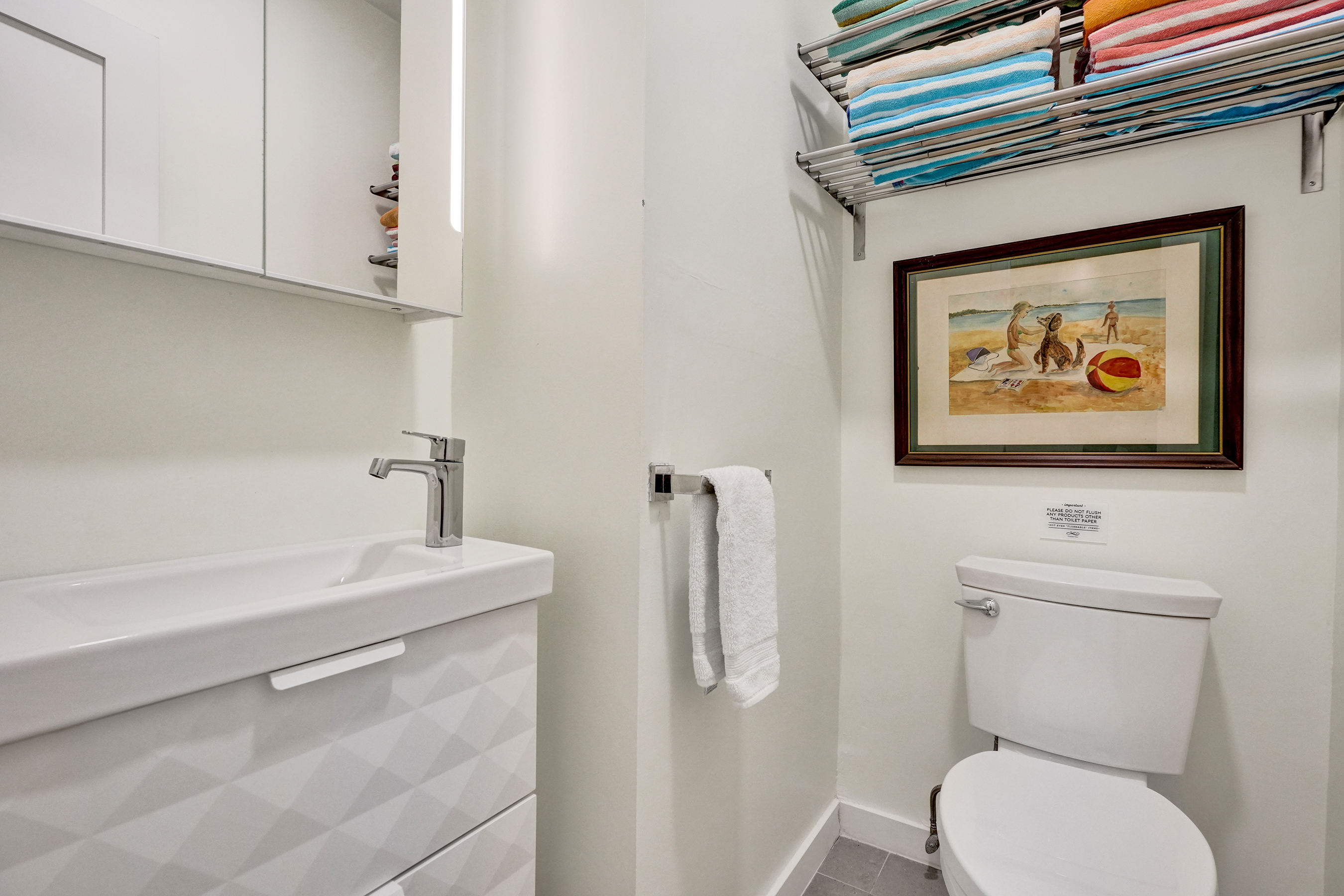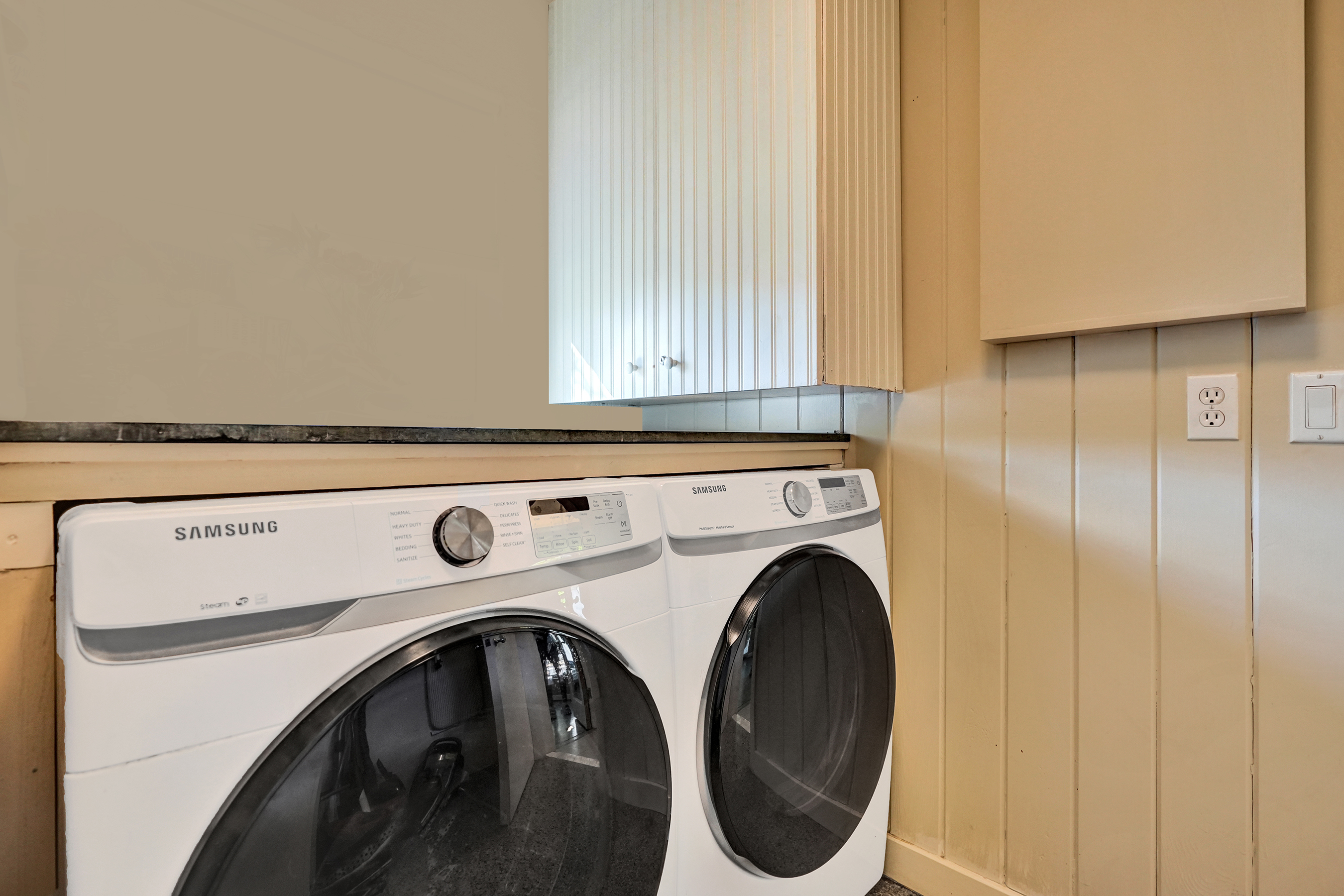 The spacious kitchen is fully equipped with modern appliances and all the essential cookware. You will also find multiple cabinets for storage, lots of counter space, and a breakfast bar with high-top seating. All the best amenities to make cooking at home a breeze!