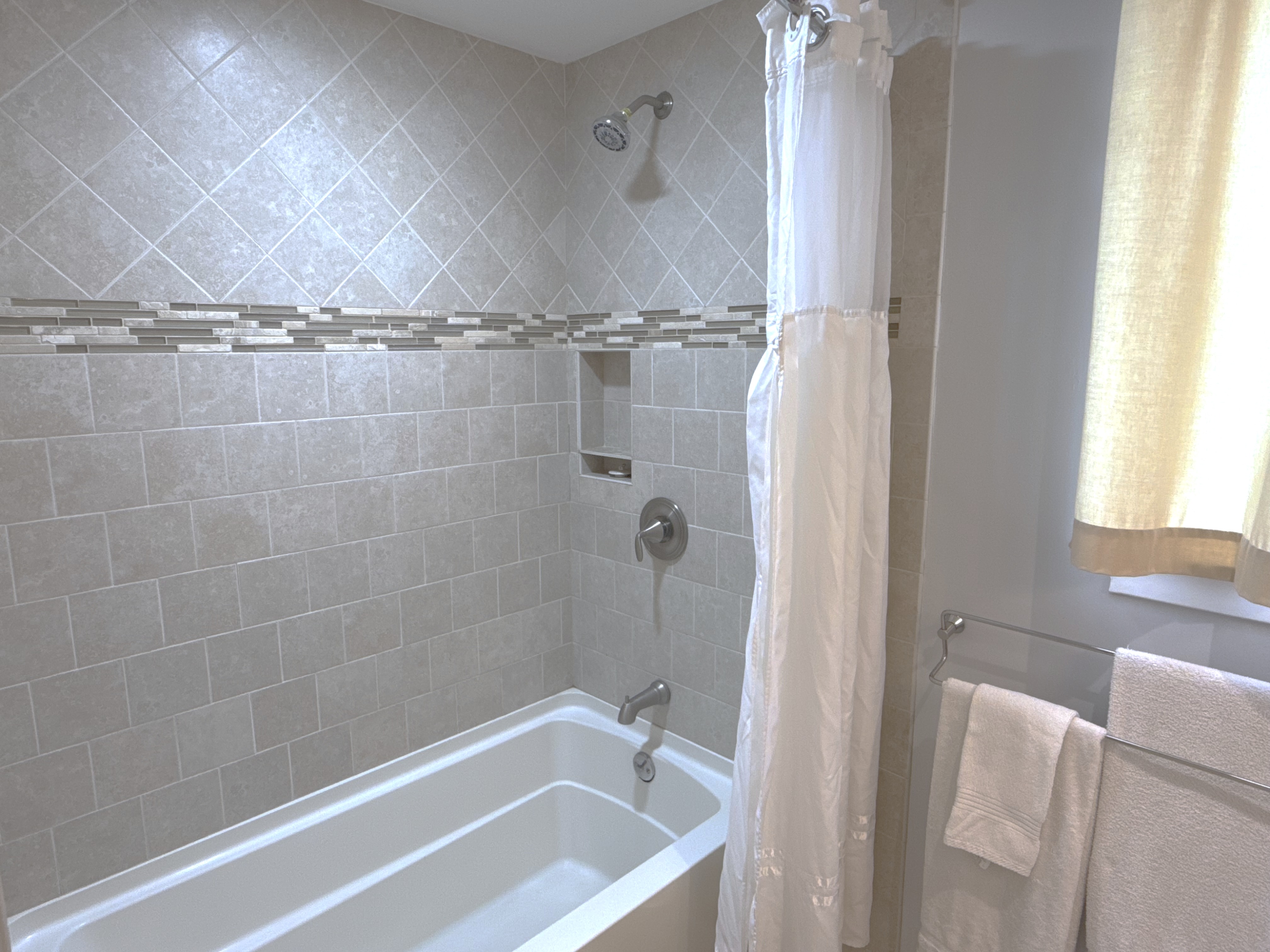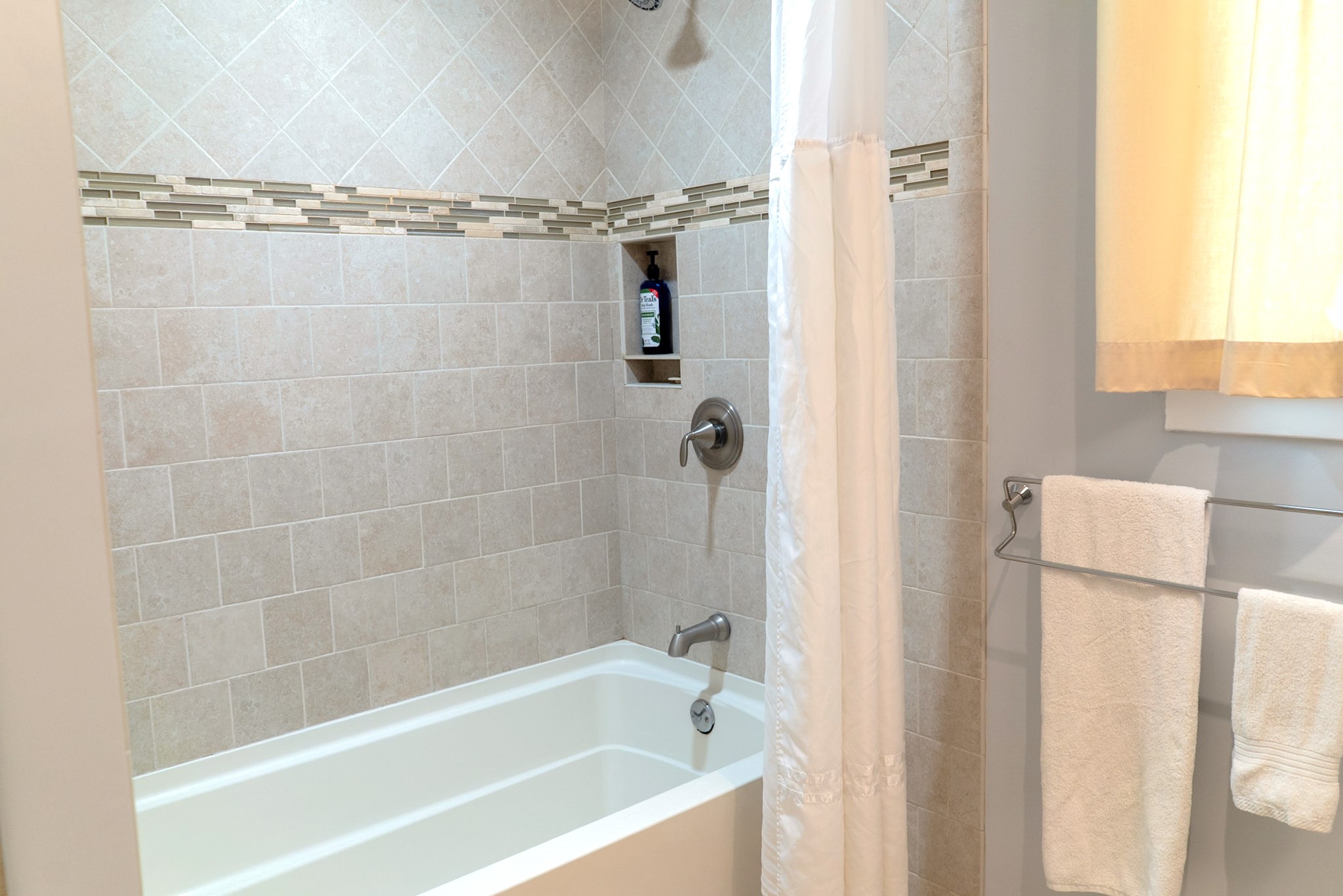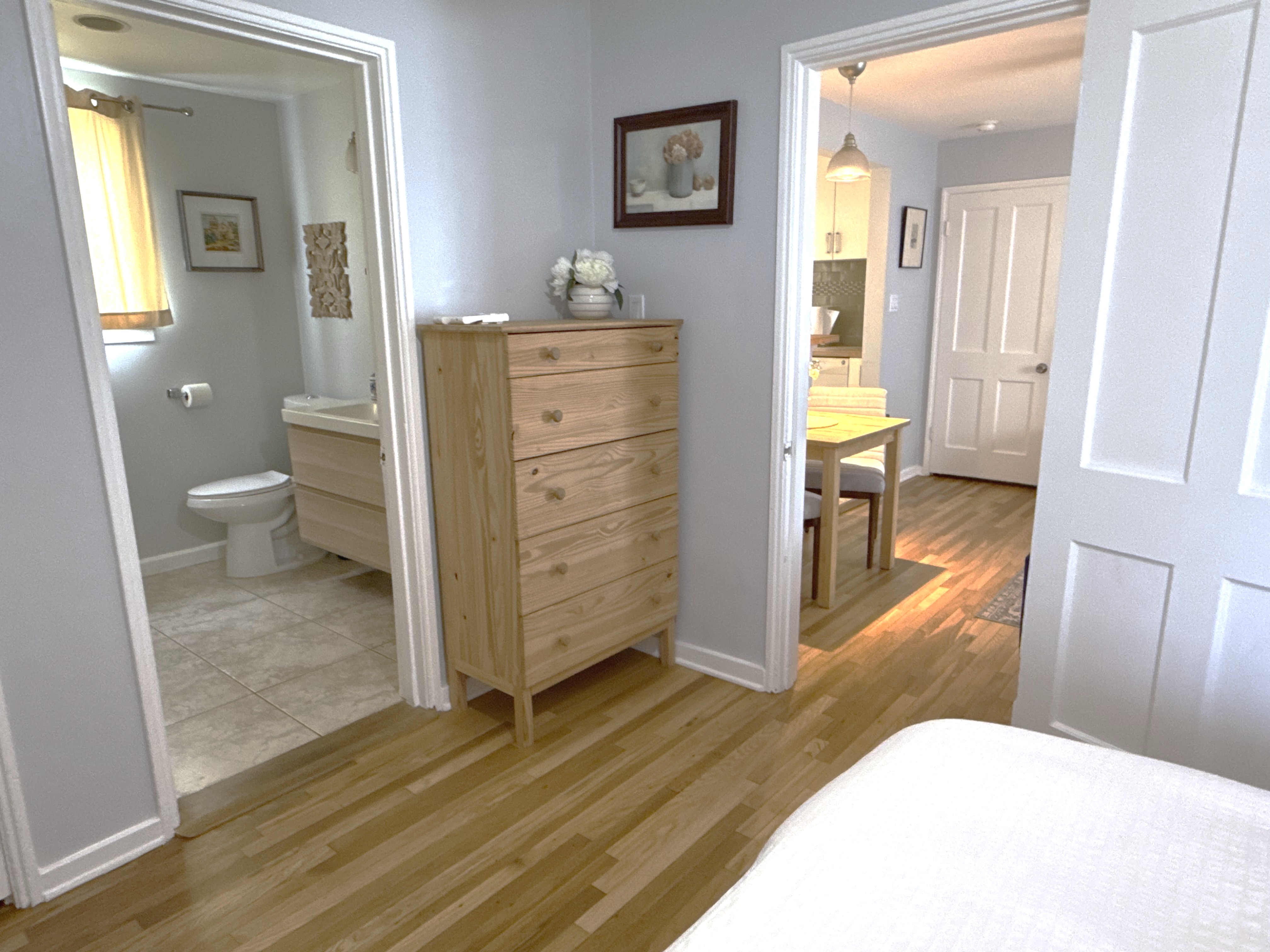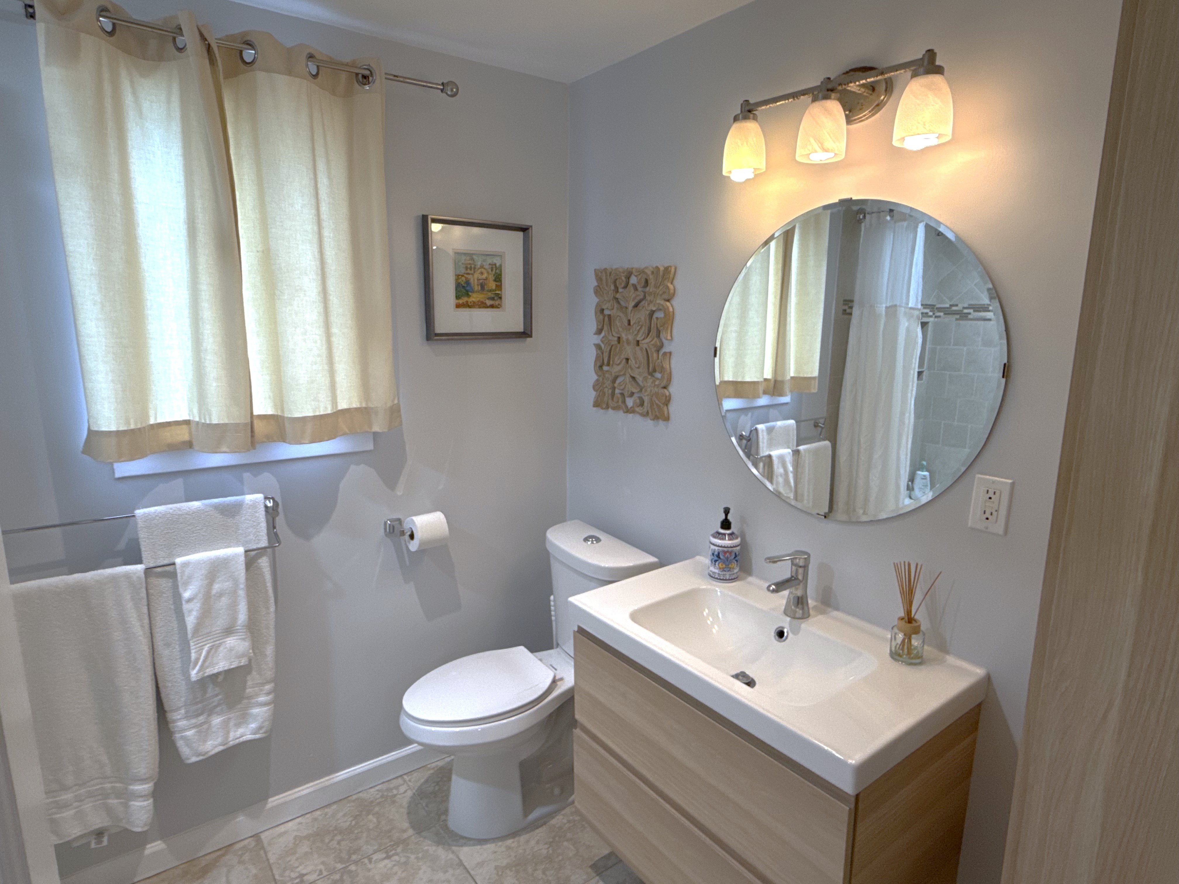 The modern bathroom, accessible by the bedroom, has a tub/shower combination.