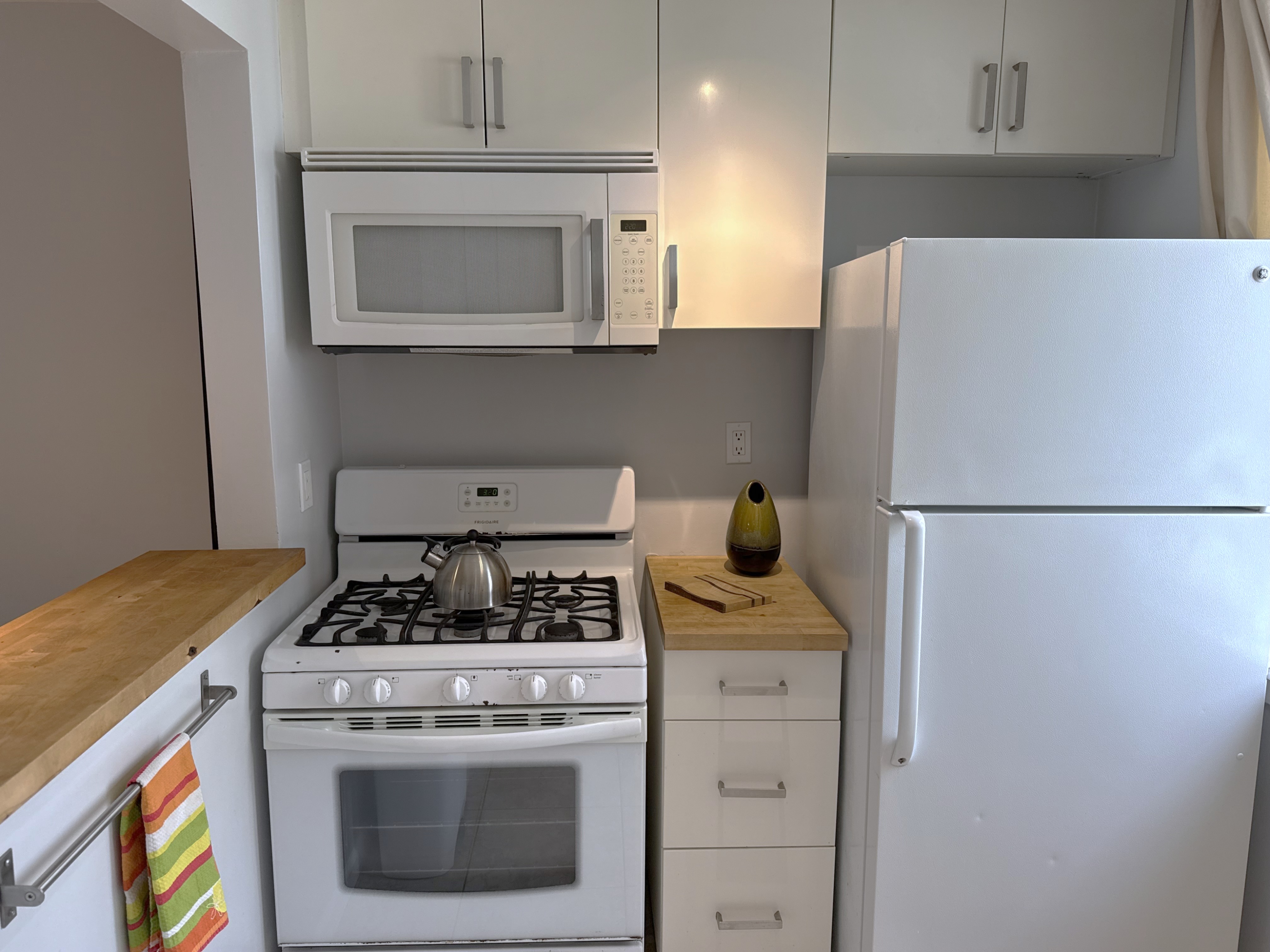 The kitchen is completely equipped with a full stove/oven, dishwasher, microwave, and a practical butcher block countertop. All kitchenware is provided, making cooking at home a delightful experience.
