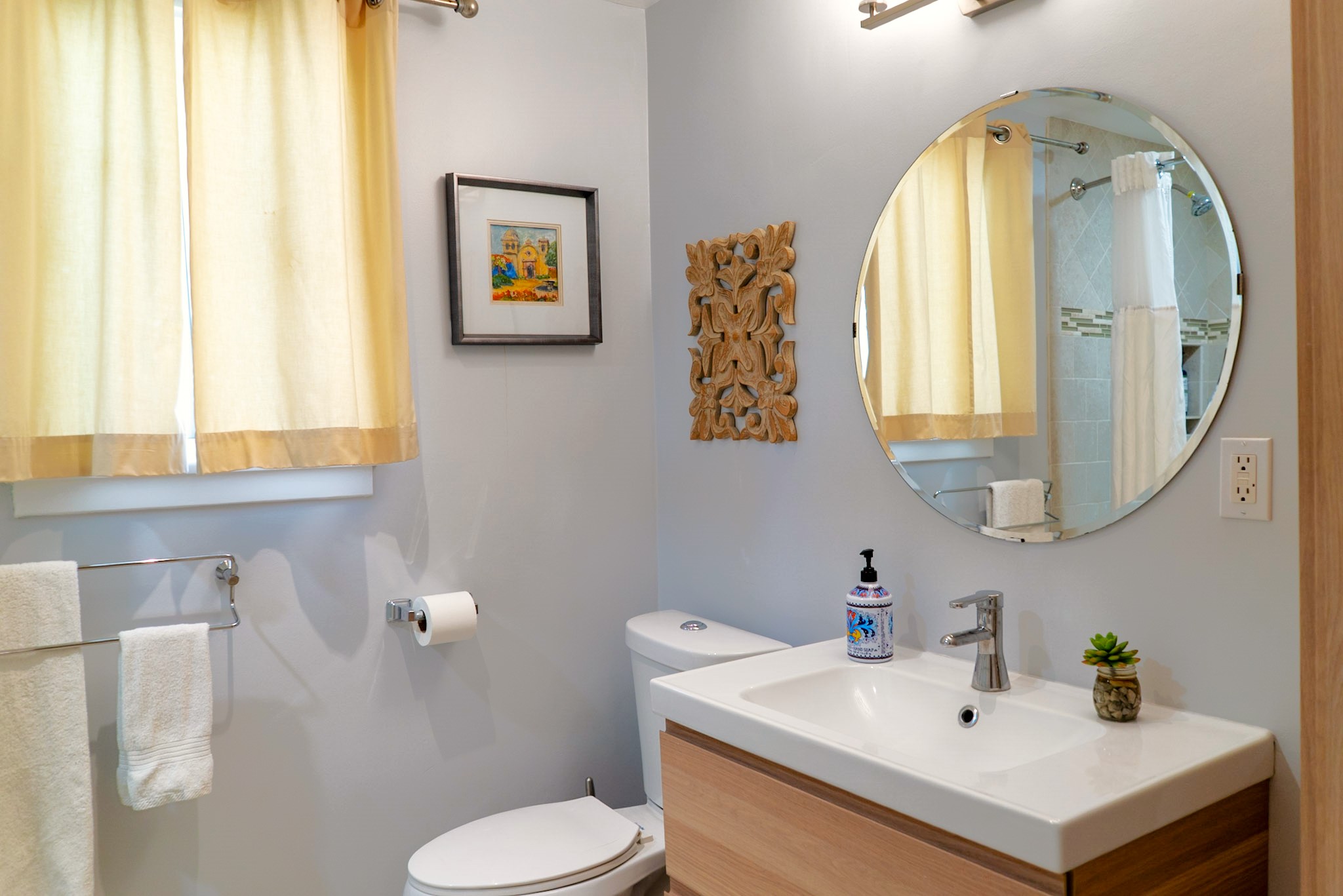 The bedroom features all the essentials for a restful night of sleep; a queen-size bed with luxurious linens and pillows, a ceiling fan, and A/C. With its large window, the room has abundant natural light creating a bright and lovely ambiance.