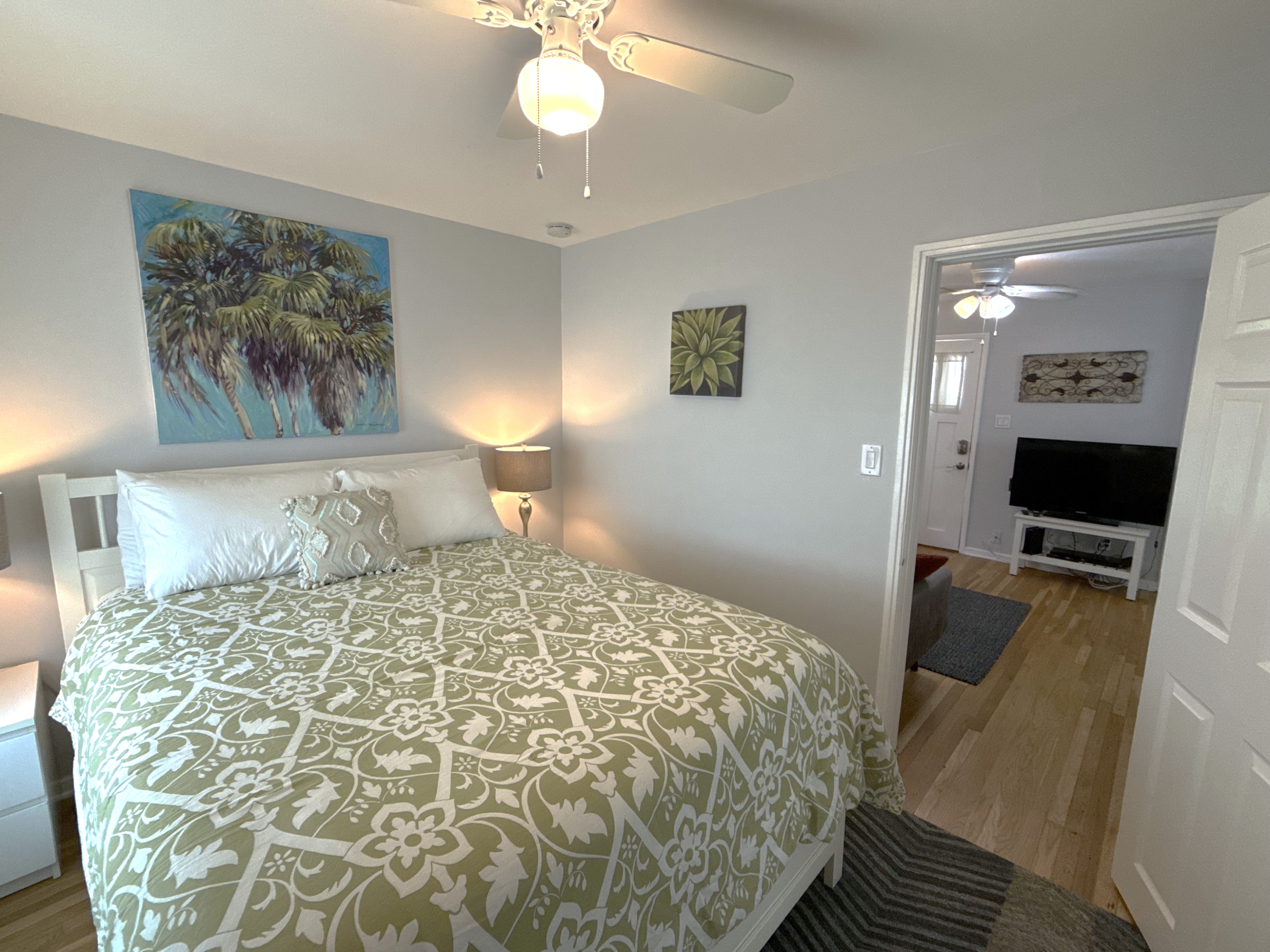 For your absolute comfort, the bedroom offers a peaceful decor, a queen-size bed, deluxe linens and pillows, a ceiling fan, and a mini-split.