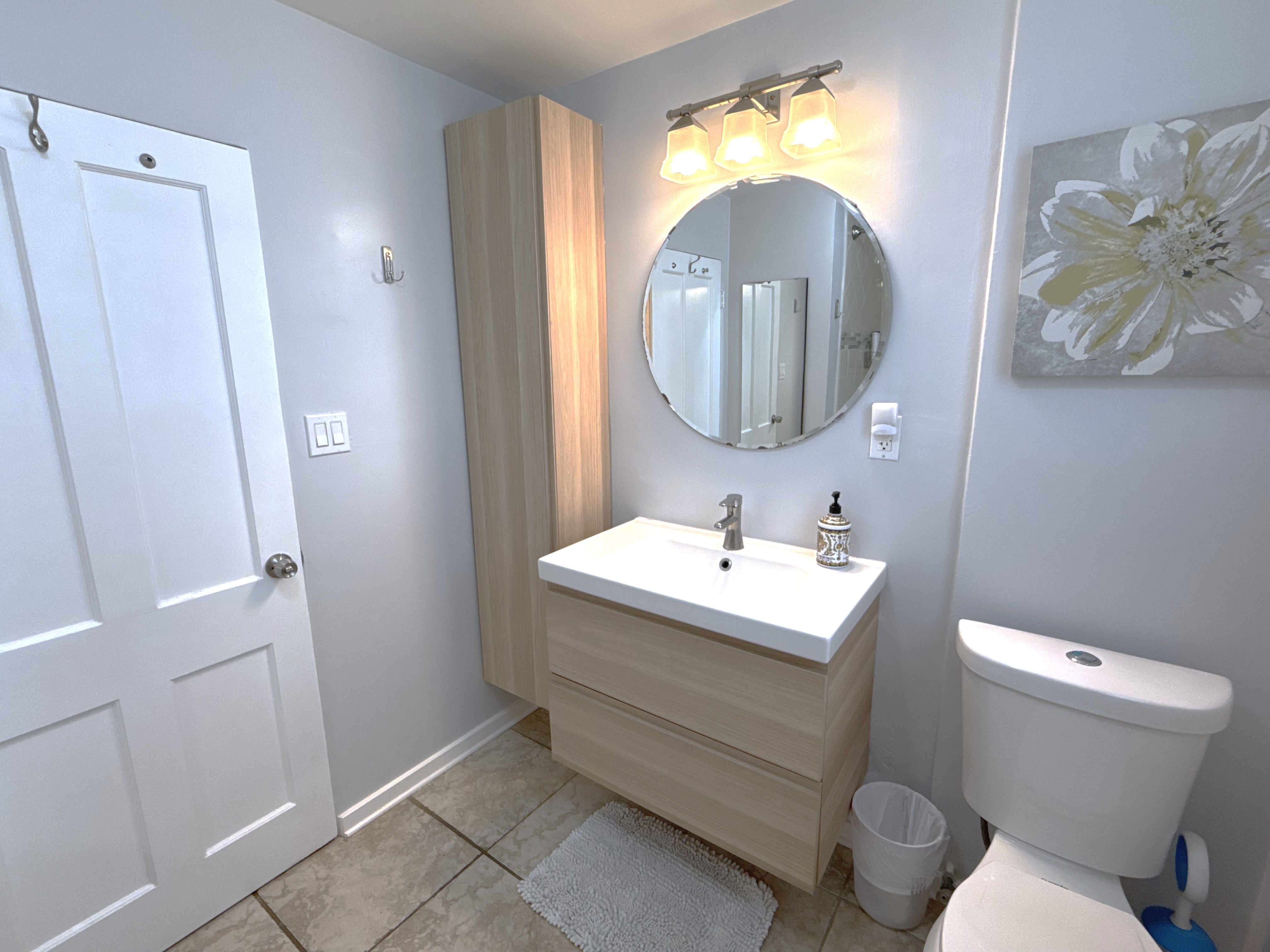 The modern and bright bathroom, accessible via the bedroom, offers a tub/shower combination.