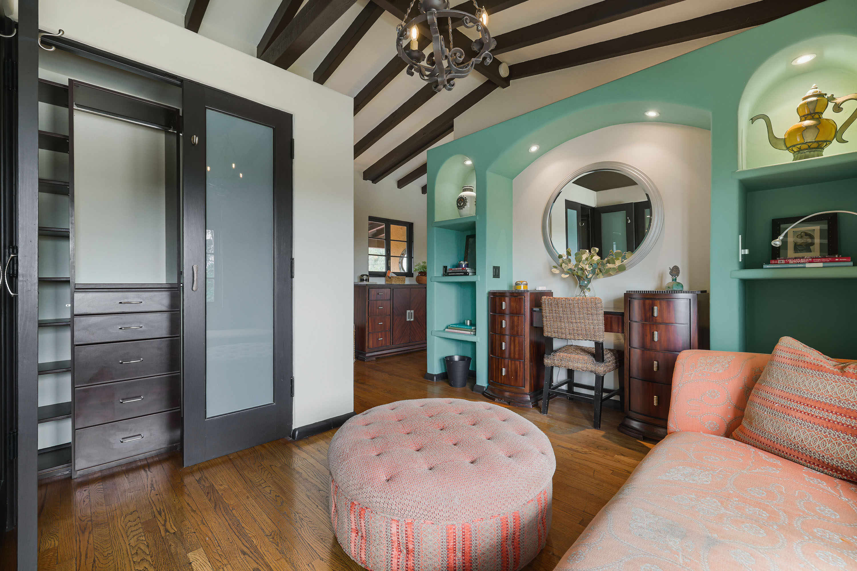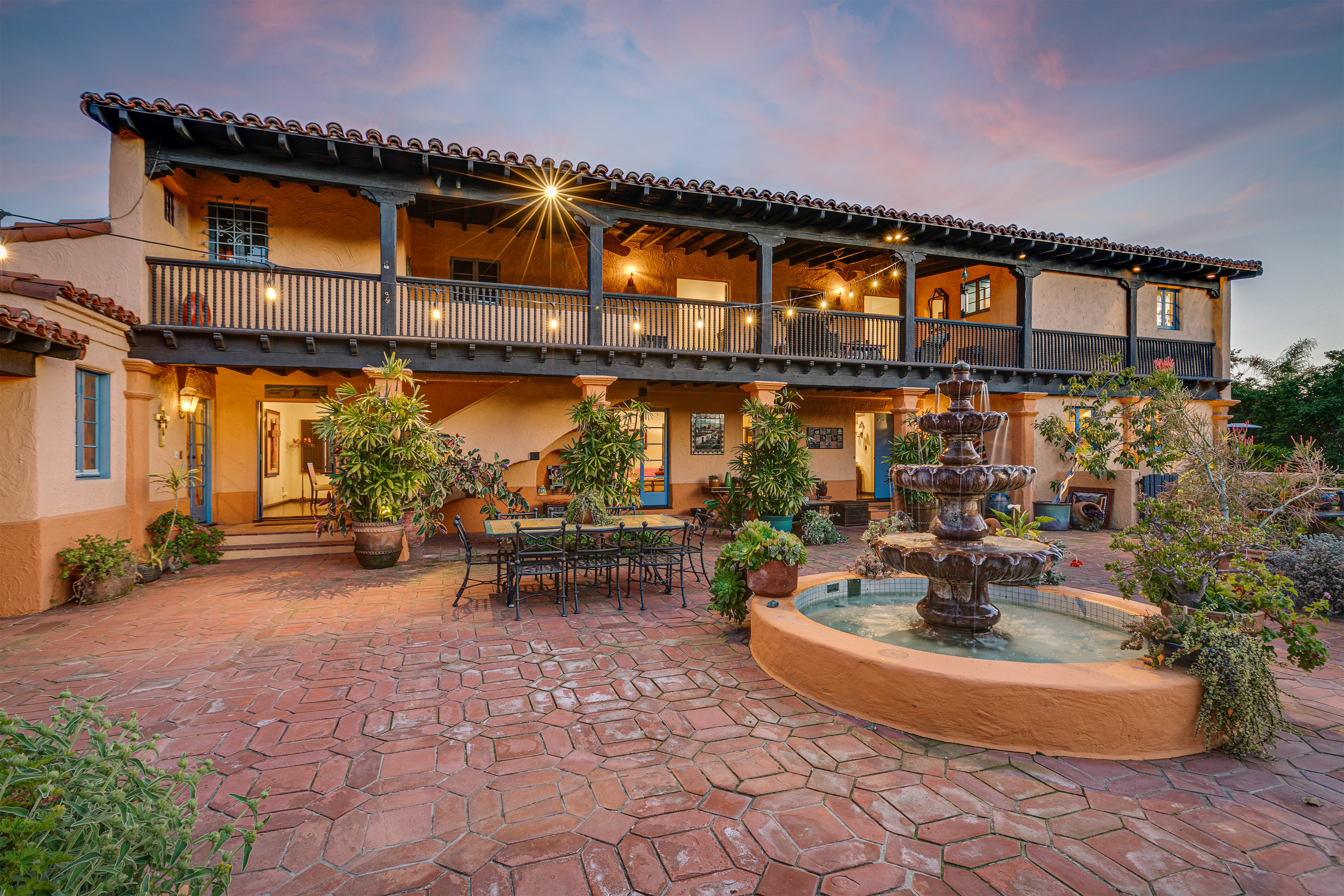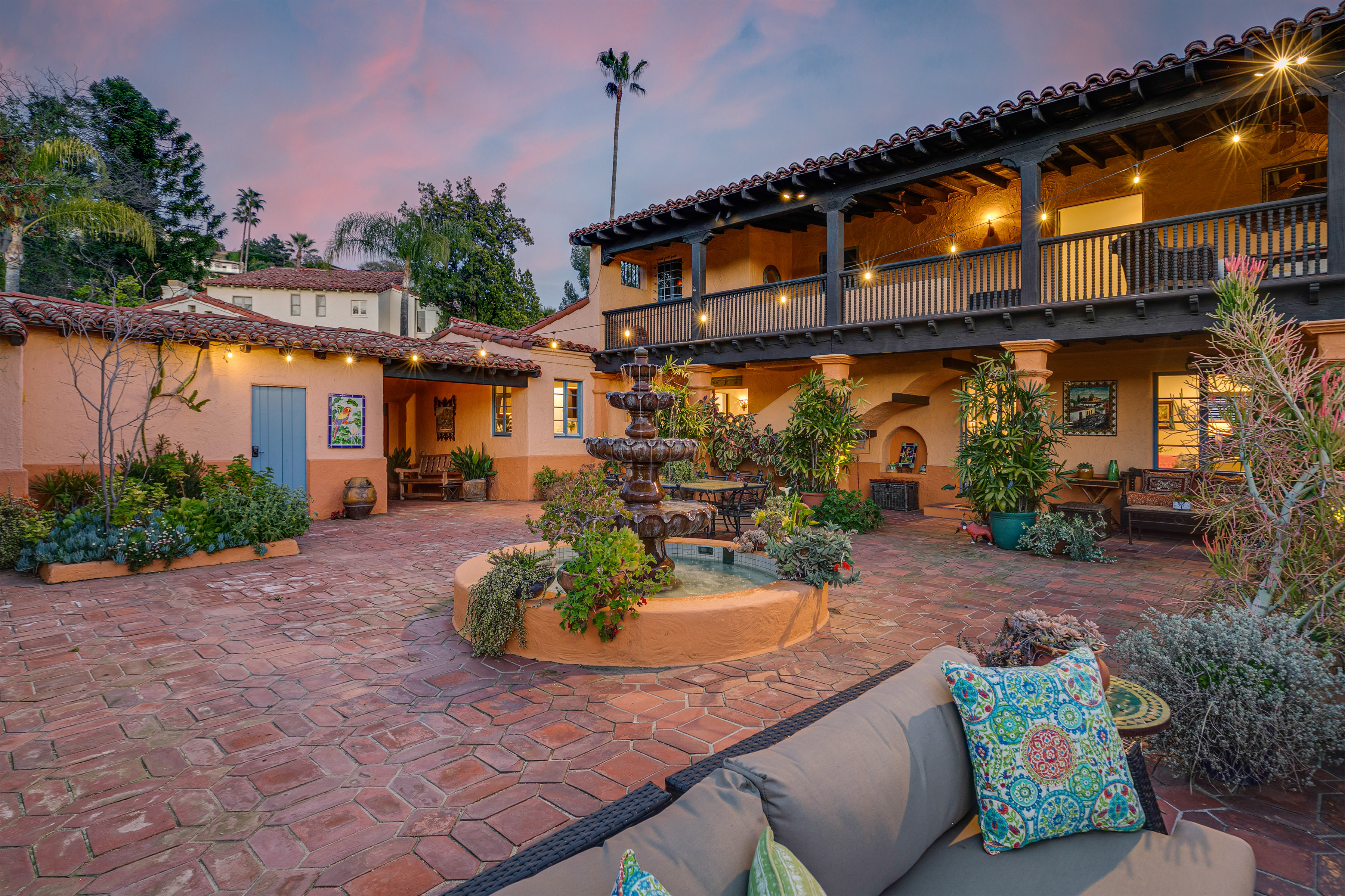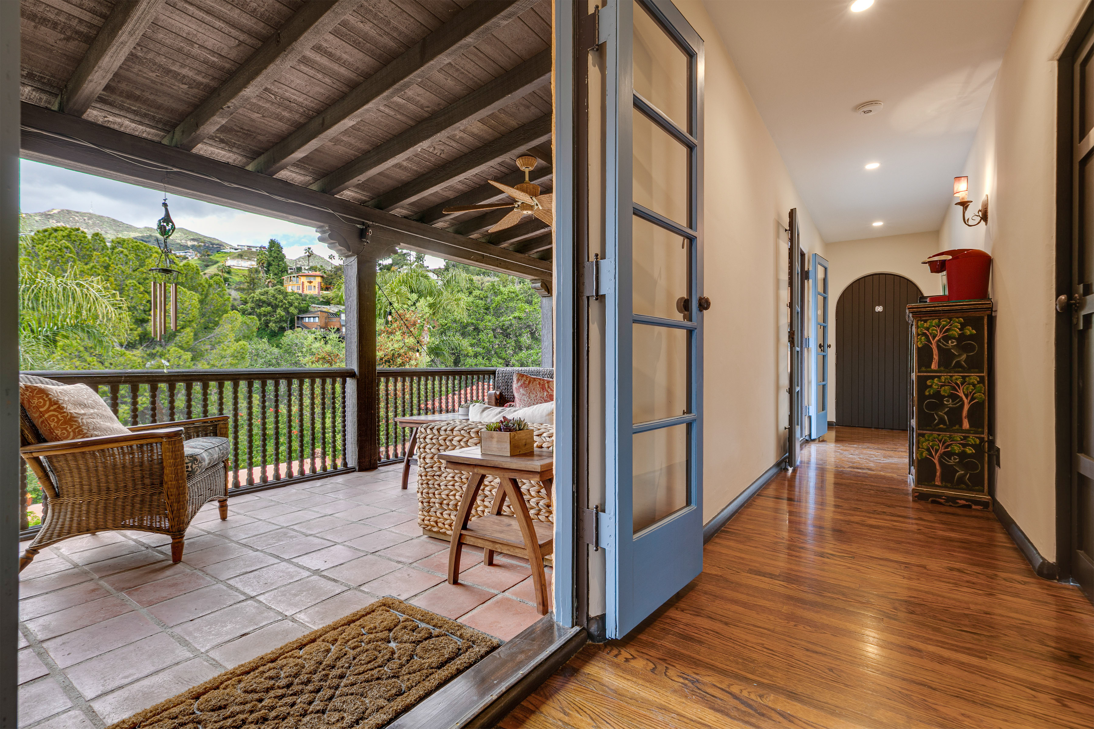 This luxurious California Hacienda estate seamlessly blends historic charm with modern comfort. The owners have offered to adjust this home to be able to be able to accommodate a larger family by providing access to the entire property, which includes a previously inaccessible primary suite & adjacent multifunctional changing room or den. The large bathroom with heated floors & beautiful views is the perfect way to start & end your day. Additionally, they have offered access to the oversized three car garage & have EV charging available too. Located in the prestigious hills of Glendale, this property boasts a spacious living room with restored original French doors on both the north & south sides, a cozy Kiva fireplace, & classic restored hardwood floors throughout. Flow from the living room into a formal dining area, leading to the expansive kitchen with a breakfast bar & the restored original butler's pantry.