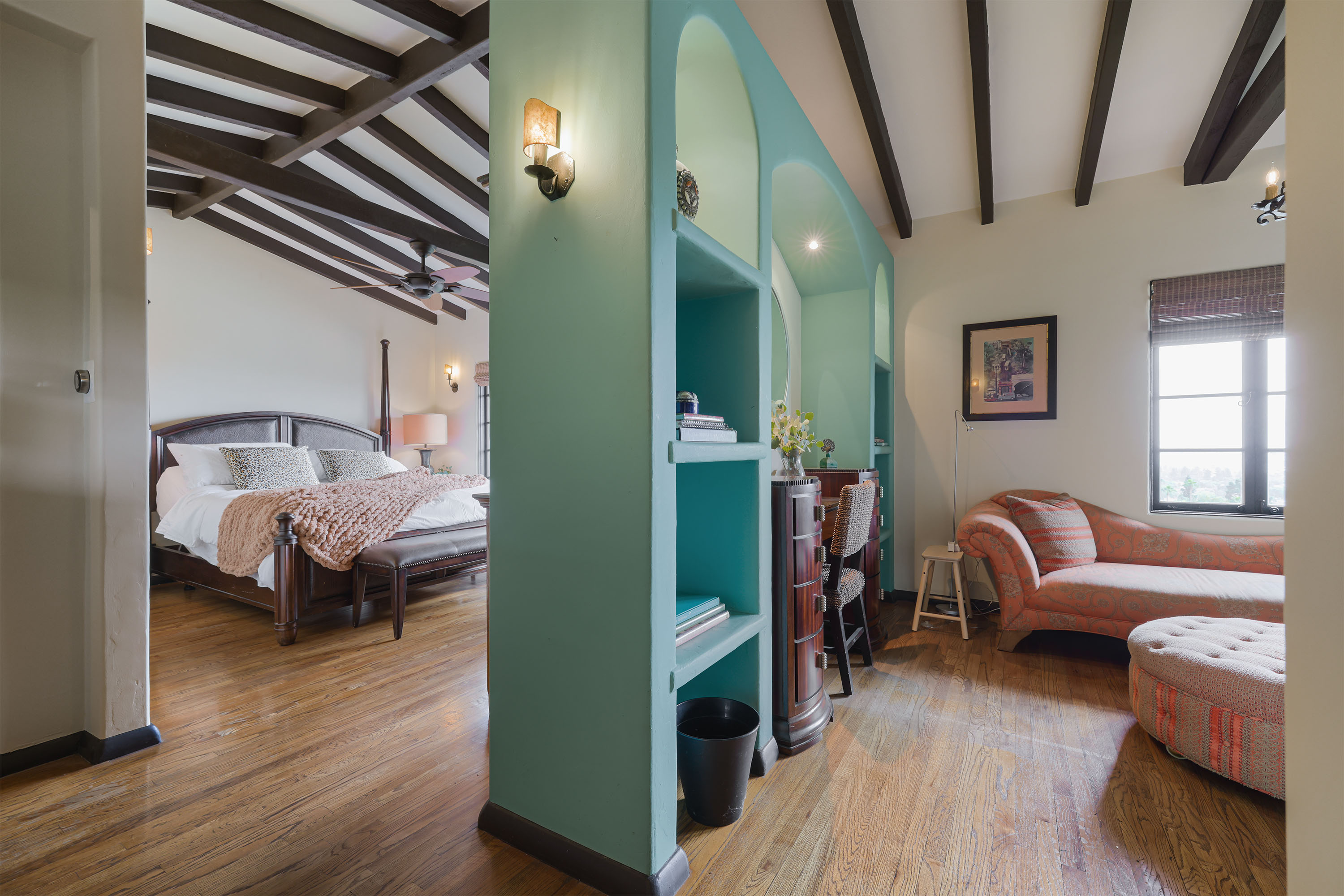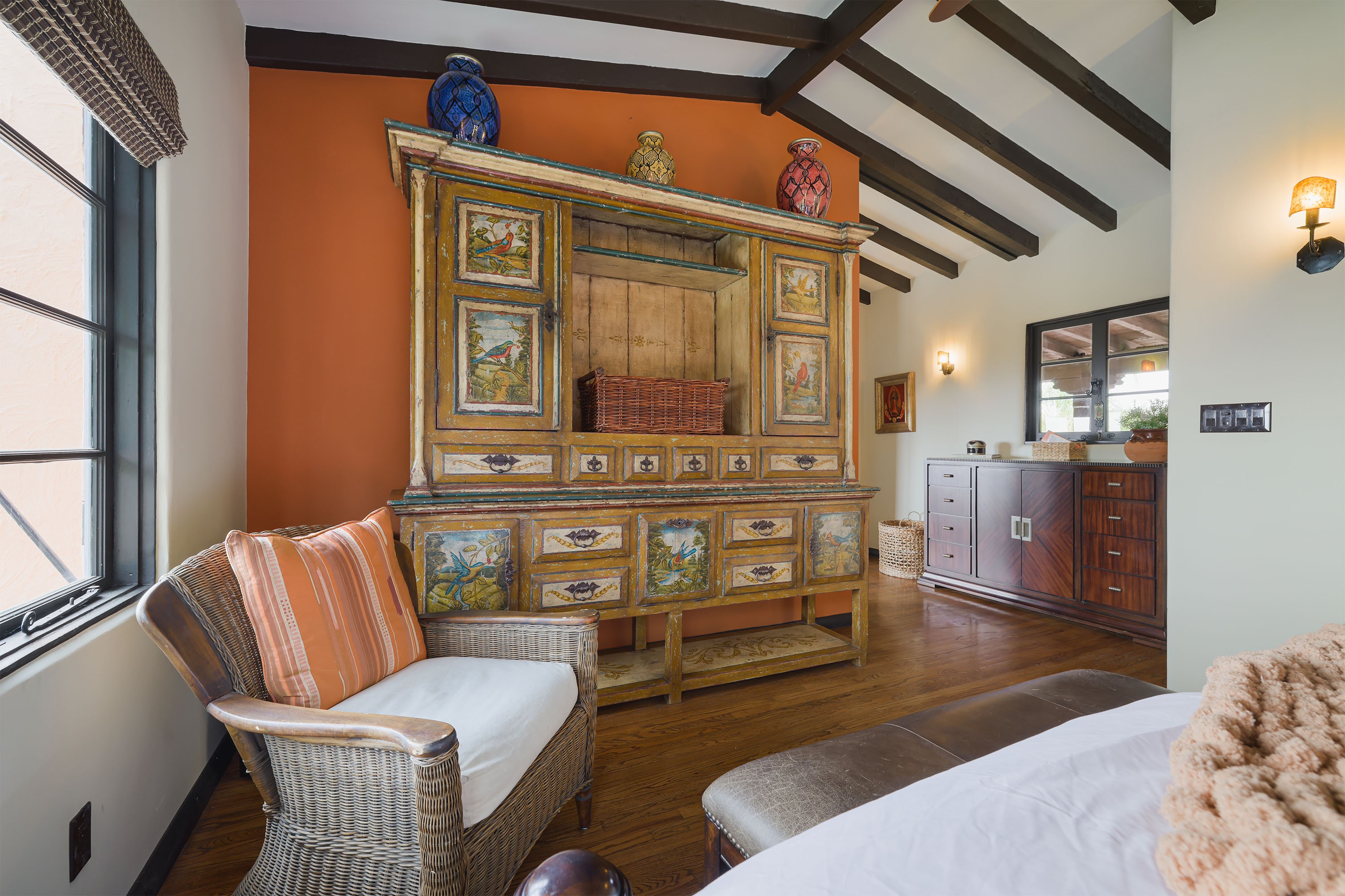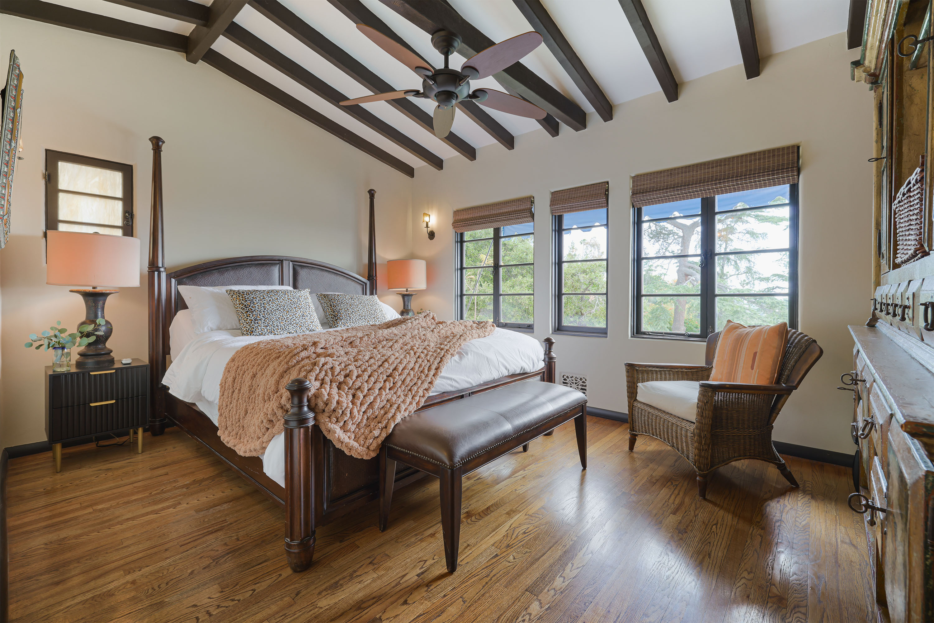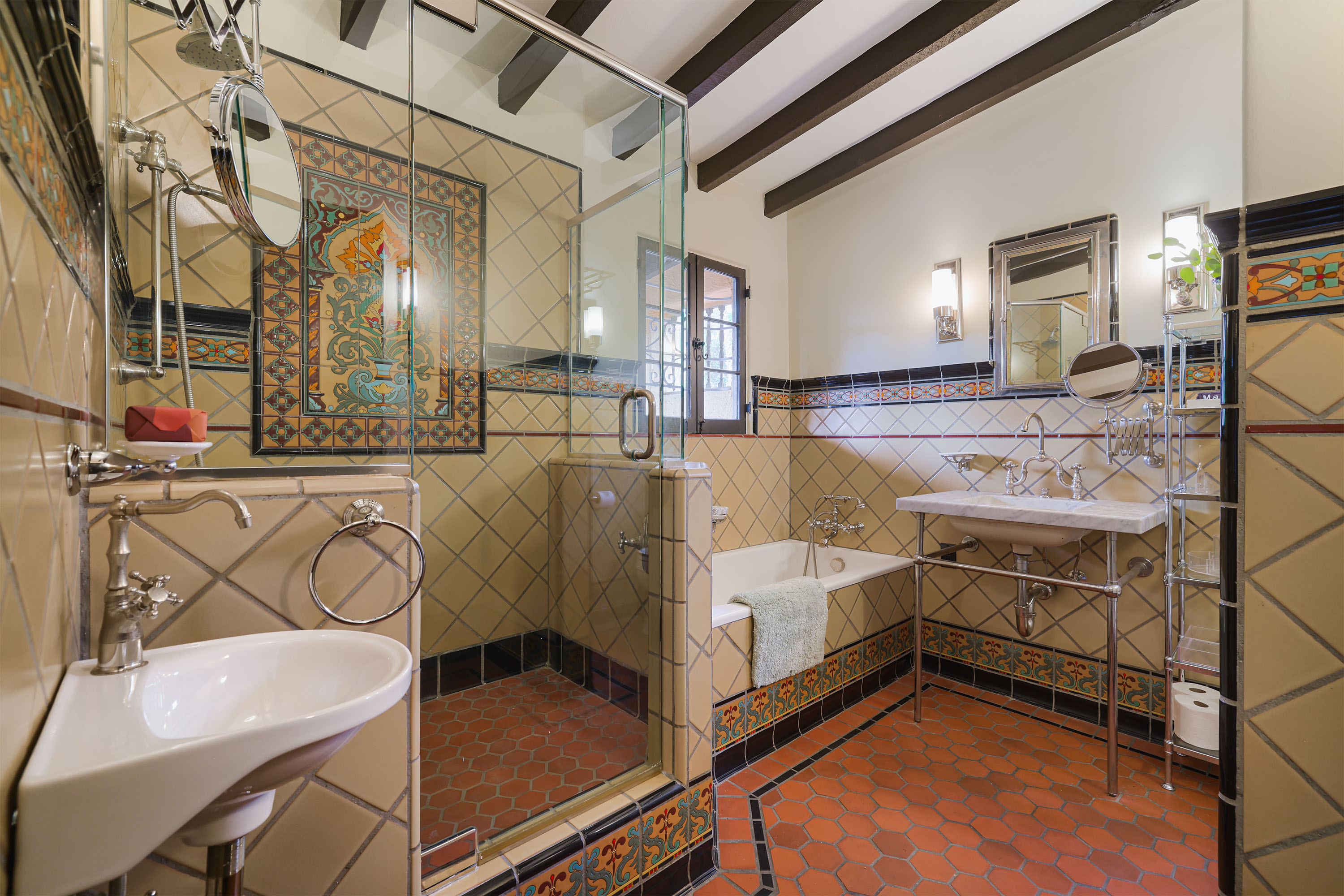 This luxurious California Hacienda estate seamlessly blends historic charm with modern comfort. The owners have offered to adjust this home to be able to be able to accommodate a larger family by providing access to the entire property, which includes a previously inaccessible primary suite & adjacent multifunctional changing room or den. The large bathroom with heated floors & beautiful views is the perfect way to start & end your day. Additionally, they have offered access to the oversized three car garage & have EV charging available too. Located in the prestigious hills of Glendale, this property boasts a spacious living room with restored original French doors on both the north & south sides, a cozy Kiva fireplace, & classic restored hardwood floors throughout. Flow from the living room into a formal dining area, leading to the expansive kitchen with a breakfast bar & the restored original butler's pantry.