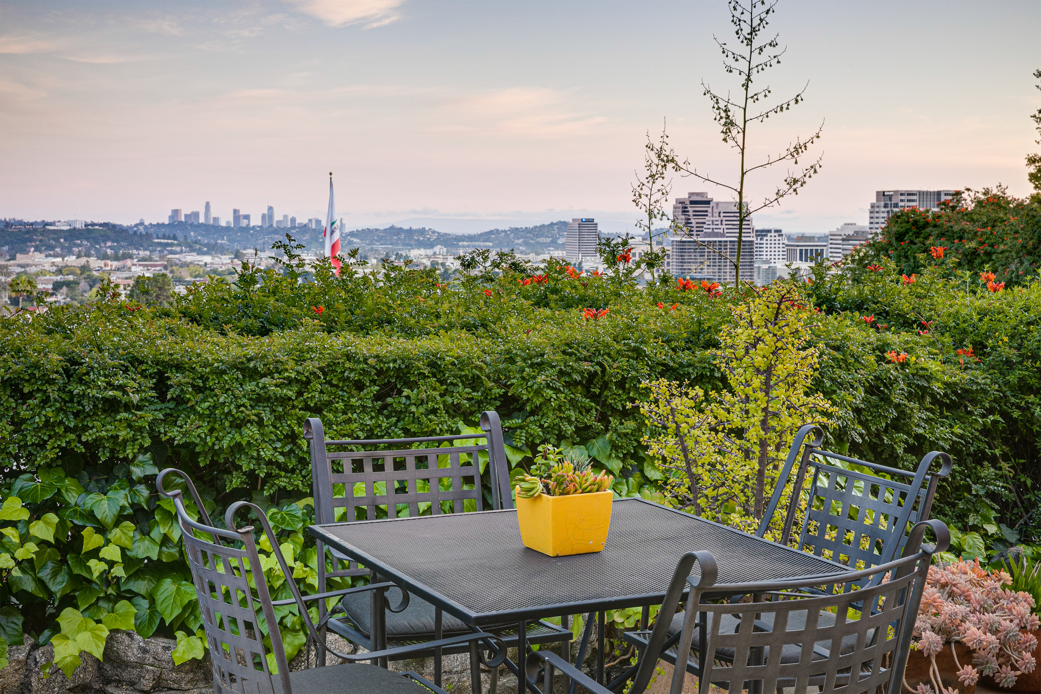 The downstairs den is designed for relaxation, featuring a 55” Smart TV, a wet bar, a 17-bottle wine cooler, & a convenient half bath. The estate offers breathtaking views overlooking Downtown Los Angeles, stretching all the way to the Palos Verdes Peninsula & the LAX flight patterns. This property provides a luxury vacation rental experience while offering a sense of calm, making it an ideal retreat for adults.